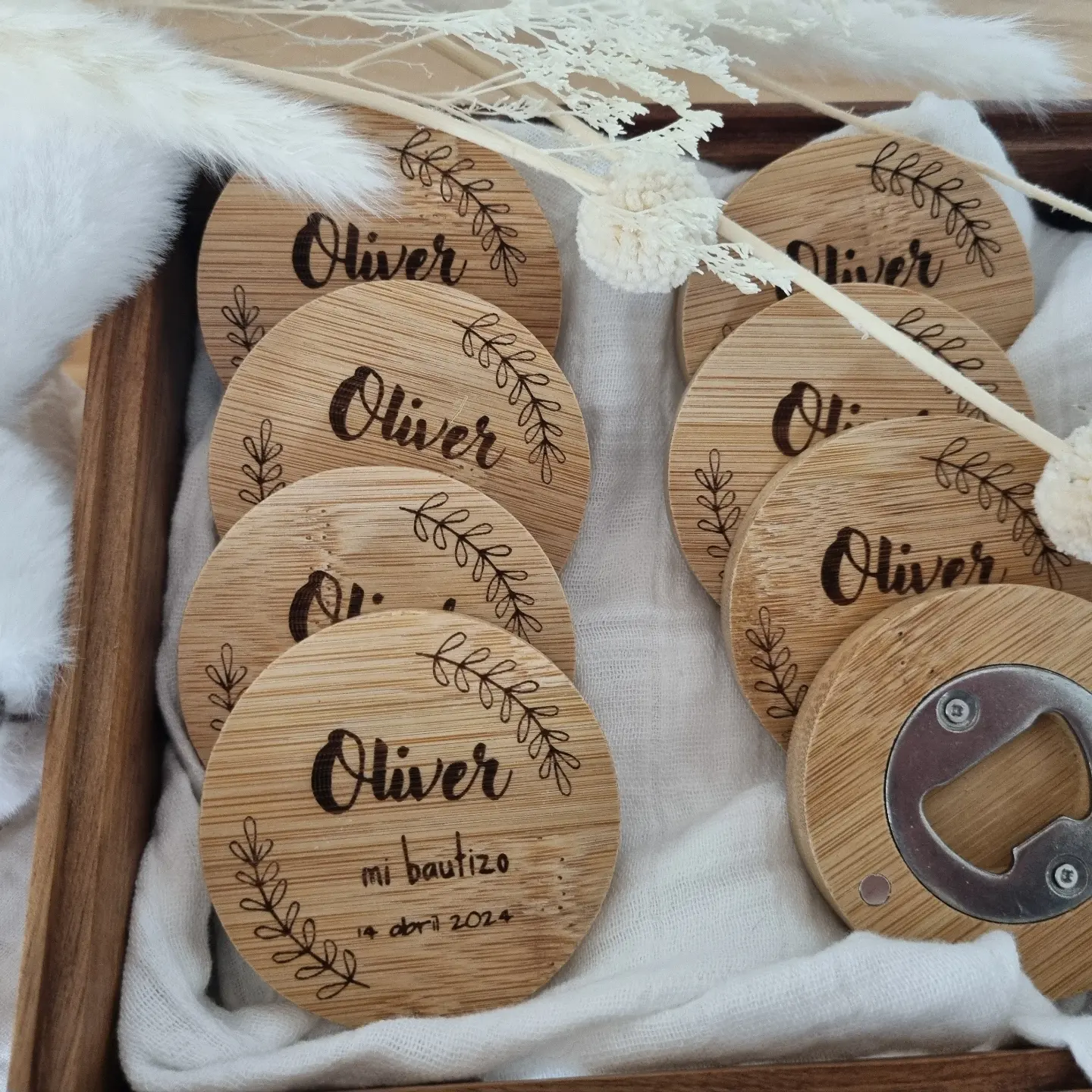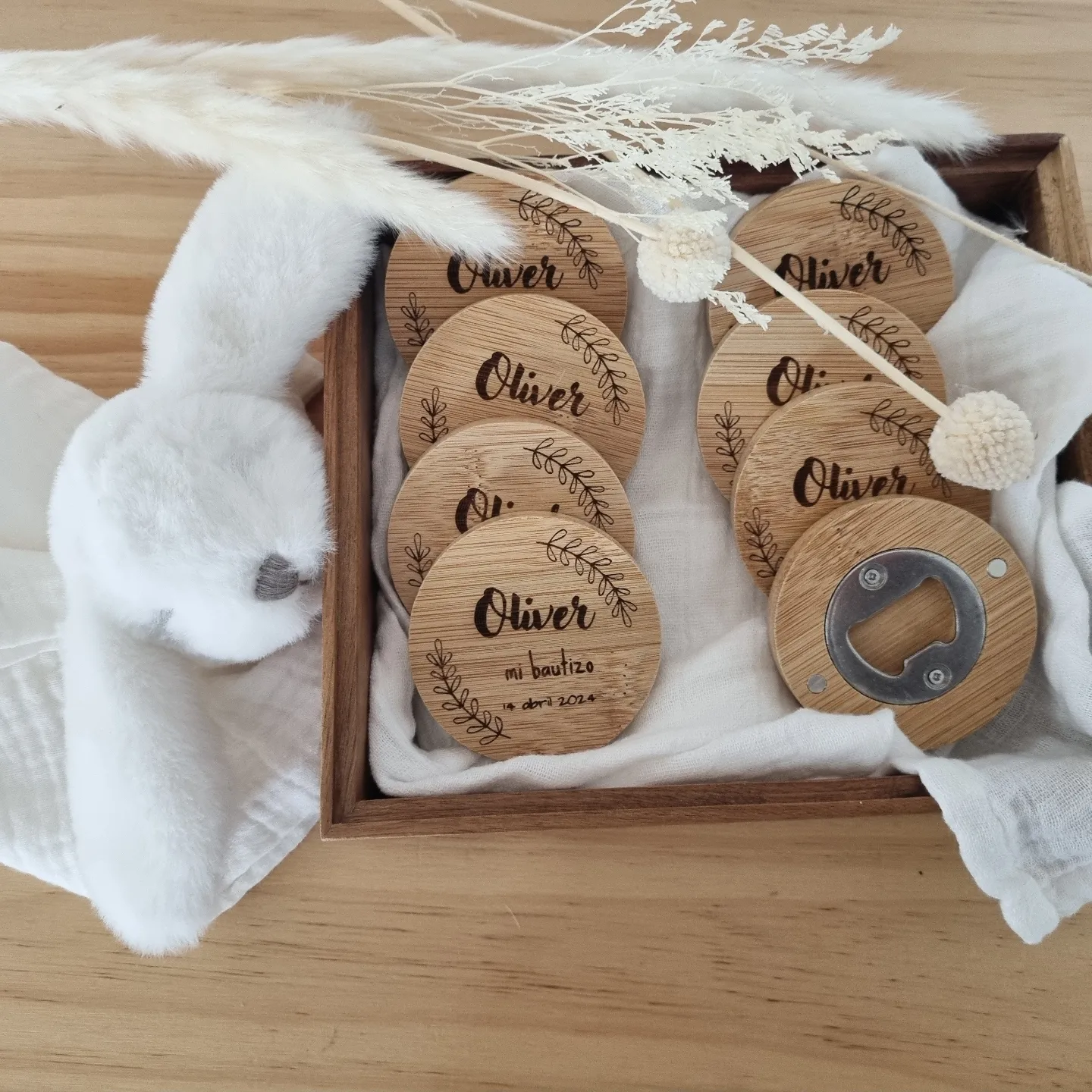 Abridor de madera imantado perfecto para cualquier celebración. Este abridor personalizado es elegante y único, fantástico para tener un detalle con tus invitados.
