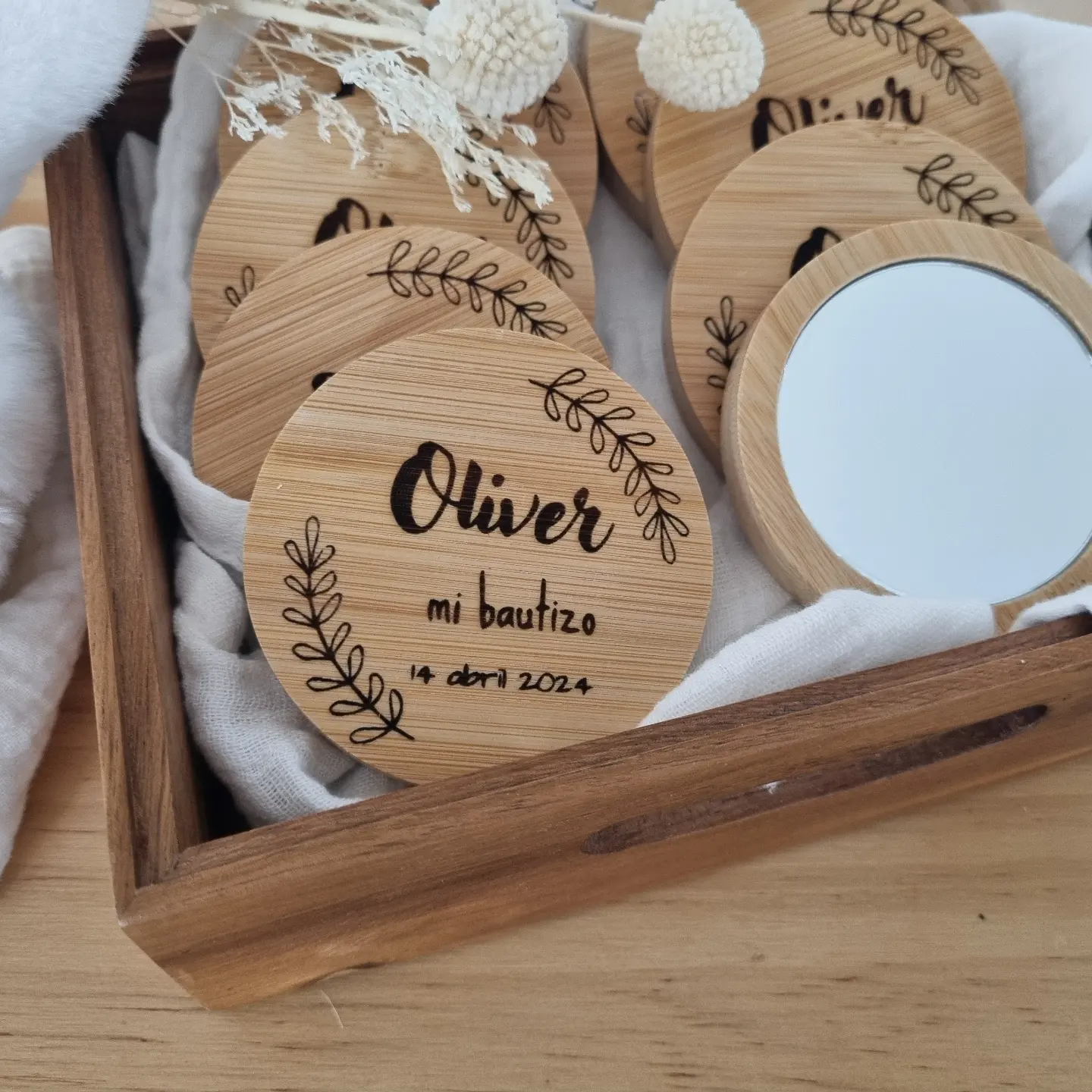 *El grabado puede variar por el tipo de madera, entre un imán/espejo u otro, los grabados no son todos iguales por que la madera de forma natural tiene betas y está tratada.